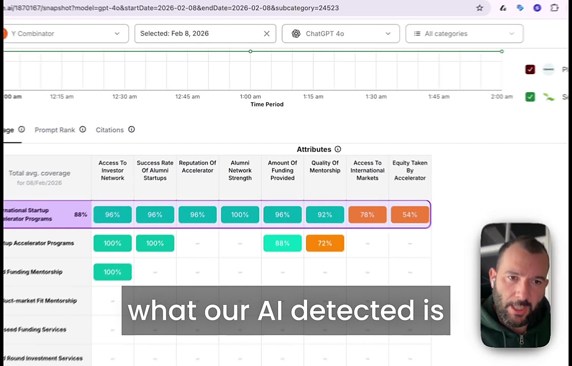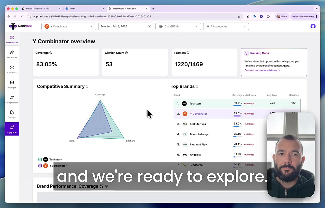 - Competitive Summary: This radar chart offers a quick visual comparison between your brand and a top competitor. It plots performance across three key dimensions (Coverage, Rank, and Citations), allowing you to instantly identify strengths and weaknesses.