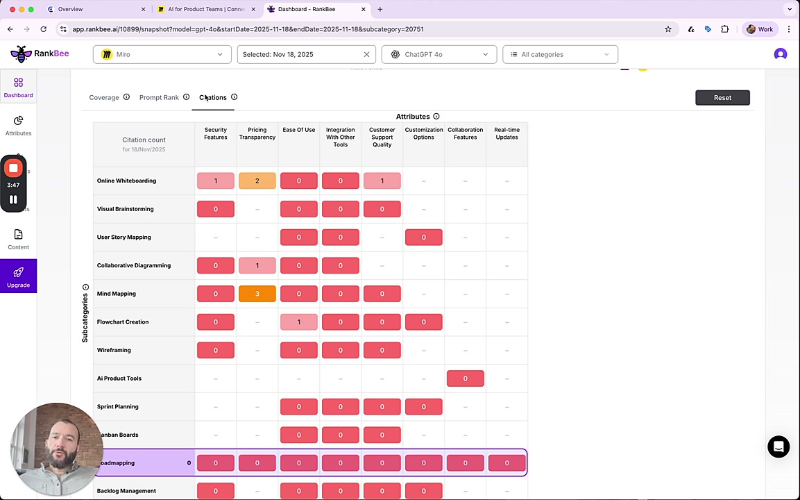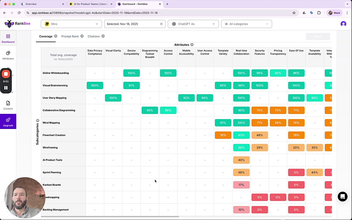 - Subcategories (Rows): The horizontal axis lists the different product categories or use cases where your brand competes, such as Online Whiteboarding, User Story Mapping, and Roadmapping.