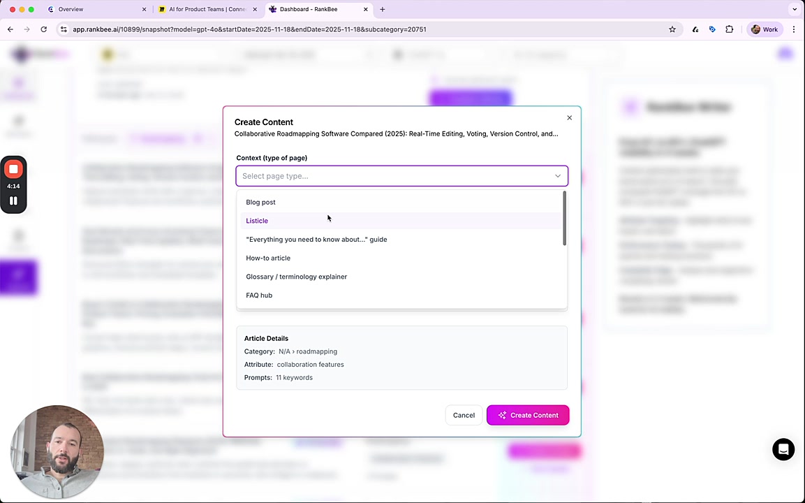 - In the modal, click the Select page type dropdown menu and choose the type of content you want to create, such as a Blog post or Listicle.